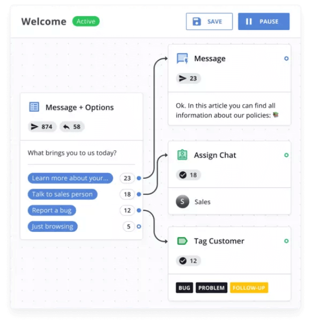 Automatically engage with your visitors via auto messages and use chatbots for the rest.